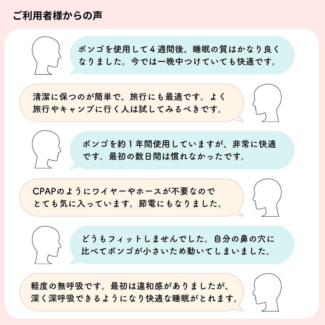 CPAPが保険適用にならない方、CPAPになじめない方、または CPAPを試すのに抵抗がある方にとって、ボンゴは効果的な CPAPの代替手段となる可能性があります。